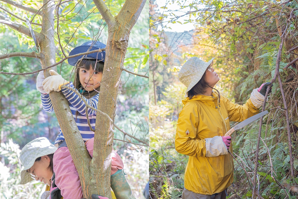通路に張り出している枝は、木々に「ごめんなさい」を言いながら、切らせてもらいました。切る枝は最小限に。子どもたちもノコギリを持ち、せっせと木を切ってくれました。