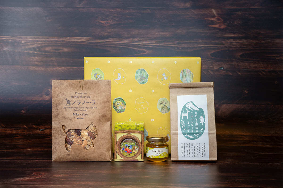 ノラノーラ、百森蜜、こびとジャム、米粉パンケーキミックスをオリジナルのギフト箱に詰め込みました!緩衝材には「スギやヒノキの木屑」を使用しており、箱を空けた瞬間に「森の香り」が広がります。大切な方へのプレゼントや、帰省時のお手土産、お持たせとしてご活用ください。