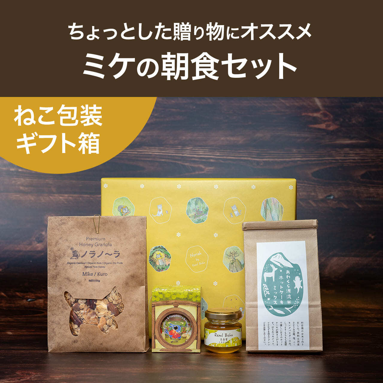 百森蜜、ノラノーラ、こびとジャム、米粉のパンケーキミックスを各1つずつセットにしました。専用の箱に収め、オリジナル包装紙で包んでお送りするので、頂き物のお返しや、大切な方へのプレゼントにピッタリ。毎日の朝食が楽しみになるギフトセットです。
