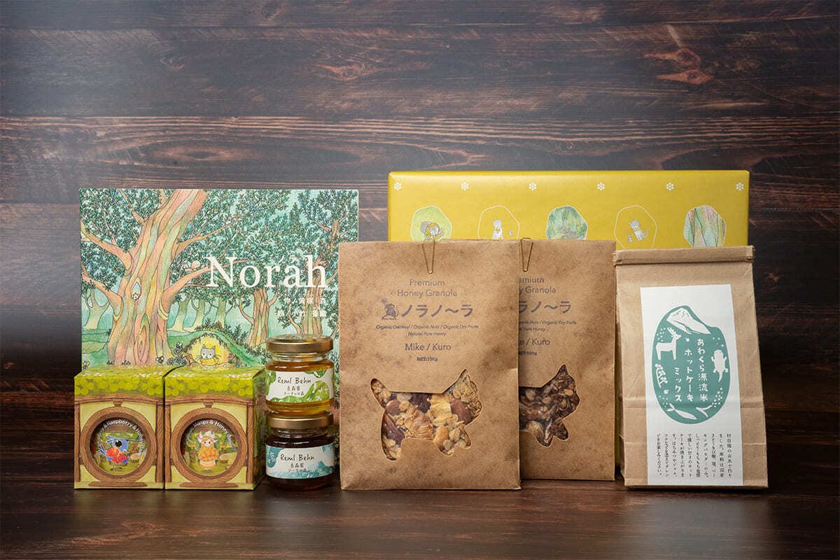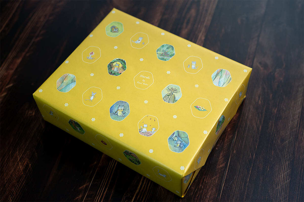 全部をギフトボックスに詰め込みました!さらに、ノラノーラの世界観を表現したオリジナル絵本付き。専用の箱に収め、オリジナル包装紙で包んでお送りするので、お中元・お歳暮や、大切な方へのプレゼントにもピッタリ。「森の香り、森の味」を、めいっぱい楽しめるギフトセットです。
